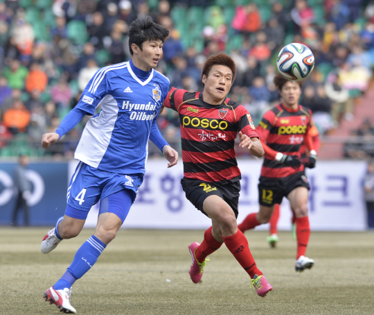 ◇울산 강민수(왼쪽)와 포항 이명주가 8일 포항 스틸야드에서 펼쳐진 2014년 K-리그 클래식 1라운드에서 볼을 두고 치열한 몸싸움을 벌이고 있다. 사진제공=포항 스틸러스