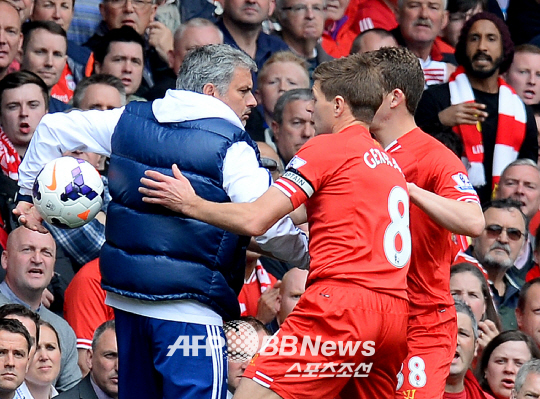 ◇첼시의 조제 무리뉴 감독이 터치 아웃된 볼을 쥐고 있는 가운데 시간이 없는 리버풀의 주장 제라드가 볼을 빼앗깃 위해 안간힘을 쓰고 있다. 리버풀(영국)=ⓒAFPBBNews = News1