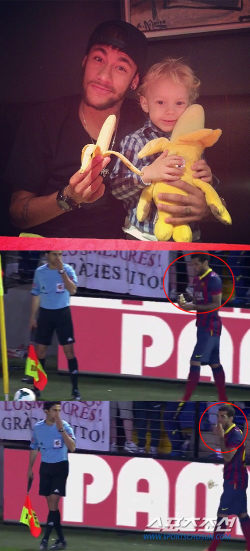 이 사진을 통해 네이마르는 팀 동료이자 브라질 대표팀 선배인 다니엘 알베스의 현명한 대처에 힘을 실었다. 이날 알베스는 2013-14시즌 프리메리리가 35라운드 비야레알전 경기 도중 불쾌한 일을 당했다. 코너킥을 차기 위해 기다리던 알베스의 눈앞에 비야레알 팬이 바나나를 투척한 것. 바나나는 세계 어디에서나 '원숭이'라고 놀리는, 인종차별적인 제스처다.