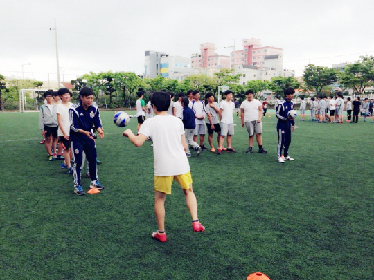 울산은 최근 세월호 추모와 관련해 조용한 분위기 속에서도 정기적인 청소년 재능기부 활동으로 학생들의 건강한 학교생활을 되찾아 주자는 취지에서 찾아가는 축구클리닉을 실시했다. 이번에 선정된 학교는 울산 동구에 위치한 대송중학교였다.