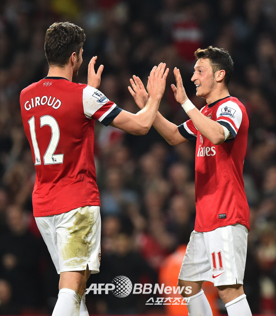 | 아스널의 외질(오른쪽)이 29일 뉴캐슬과의 경기서 팀의 두번째 골을 넣은 뒤 동료 지루의 축하를 받고 있다. ⓒAFPBBNews = News1 |