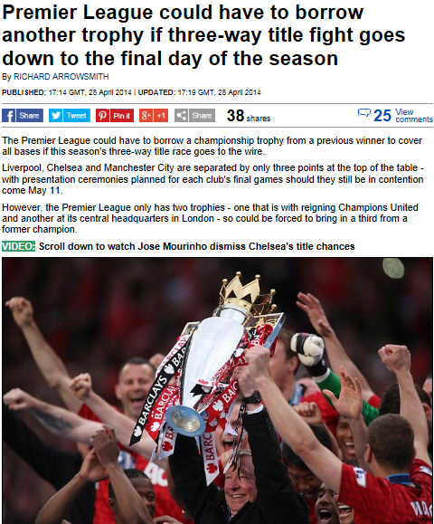 현재 EPL 선두인 리버풀(승점 80)과 2위 첼시(승점 78), 3위 맨시티(승점 77)이 우승 경쟁을 펼치고 있다. 리버풀과 첼시는 2경기씩, 맨시티는 시즌 종료까지 3경기를 남겨두고 있다. 워낙 경쟁이 치열해 우승의 향방은 5월 11일에 동시에 열리는 시즌 최종전에서 결정날 가능성이 높다. 리버풀 5월 11일 뉴캐슬과의 홈경기를 갖고, 첼시는 카디프시티 원정을 떠난다. 맨시티는 웨스트햄을 안방에서 상대한다. 도시도 각각 다르고, 거리도 멀다. 우승컵을 당일에 이동시키는 것은 사실상 불가능하다.