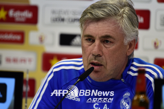 Real Madrid's Italian coach Carlo Ancelotti looks on during a press conference at Valdevebas, Real Madrid's training ground on April 15, 2014, on the eve of their Spanish Copa del Rey (King's Cup) final football match against FC Barcelona. AFP PHOTO/ JAVIER SORIANO
