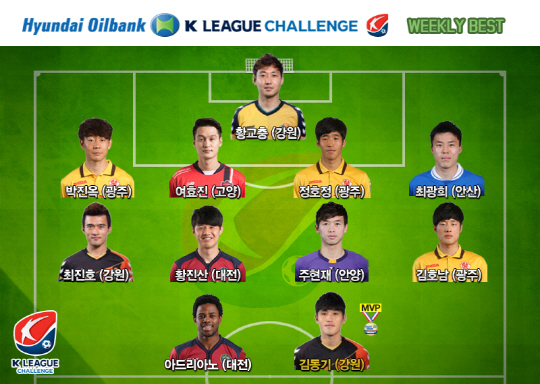 강원의 시즌 첫 승을 이끈 김동기는 챌린지(2부리그) 6라운드 MVP의 영예를 안았다. 프로연맹은 '단 하나의 슈팅을 득점으로 연결시킨 집중력이 팀의 첫 승을 이끌었다'고 평했다. 챌린지 6라운드 베스트11에는 김동기를 비롯해 최진호 황교충(이상 강원) 아드리아노 황진산(이상 대전) 김호남 정호정 박진옥(이상 광주) 여효진(고양) 최광희(안산) 주현재(안양)가 이름을 올렸다. 부천에 2대1로 역전승 한 대전은 6라운드 베스트팀으로 지명됐다. 박상경 기자 ppark@sportschosun.com