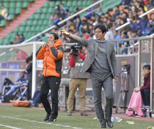 ◇황선홍 포항 감독(오른쪽)이 지난달 22일 포항 스틸야드에서 펼쳐진 수원과의 2014년 K-리그 클래식 3라운드에서 선수들에게 지시를 내리고 있다. 사진제공=포항 스틸러스