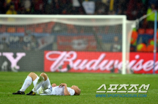 | ◇차두리가 지난 2010년 6월 27일(한국시각) 포트엘리자베스에서 펼쳐진 우루과이와의 남아공월드컵 16강전에서 패한 뒤 그라운드에 누워 아쉬움을 삼키고 있다. 포트엘리자베스(남아공)=김경민 기자 kyungmin@sportschosun.com |