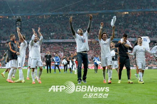 레알 마드리드 선수들이 30일 바이에른 뮌헨을 꺾고 유럽챔피언스리그 결승 진출을 확정지은 뒤 환호하고 있다. ⓒAFPBBNews = News1