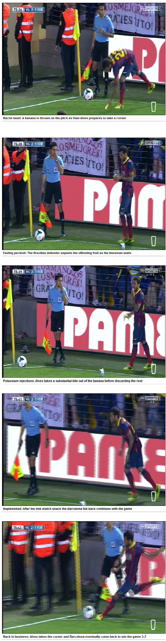 비야레알의 한 팬은 바르셀로나와의 홈경기 후반 30분경 코너킥을 차기 위해 나선 다니엘 알베스에게 바나나를 던졌다. 유럽축구계에서 바나나 투척행위는 '인종차별'을 의미한다. 하지만 알베스는 당황하거나 흥분하지 않았다. 오히려 바나나를 주워들어 껍질을 깐 뒤 먹어치웠다. 그는 경기 후 '누가 바나나를 던졌는지는 모르지만 오히려 그에게 감사한다. 좋은 크로스를 올리도록 힘을 주었다'고 말했다. 이 건 기자 bbadagun@sportschosun.com