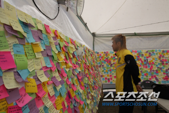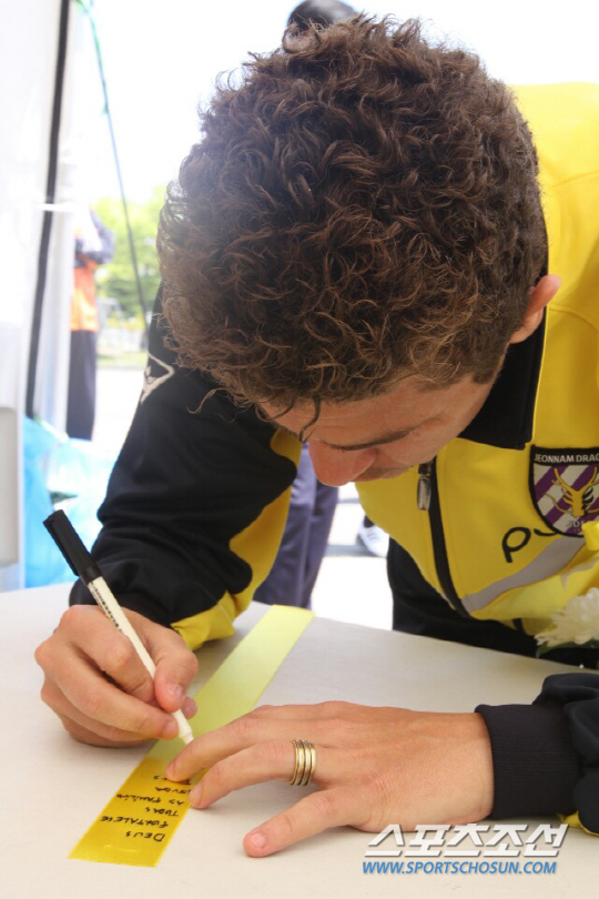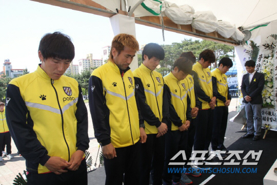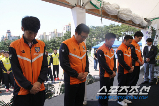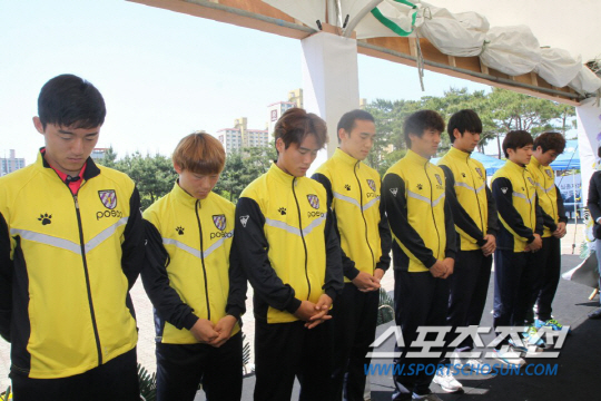 하석주 감독이 이끄는 전남 드래곤즈 선수단이 7일 오전 전남 광양시청 앞 시민광장에 마련된 '세월호 침몰사고 희생자 합동분향소'를 찾았다.