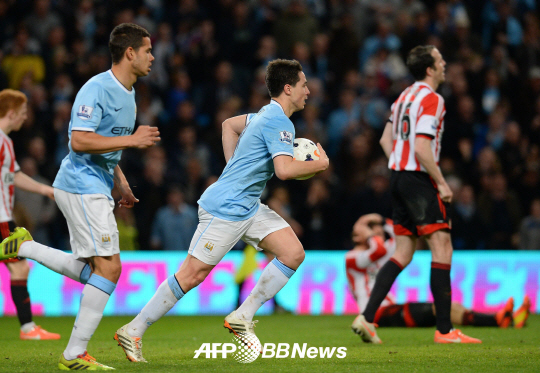 맨시티의 나스리가 17일 선덜랜드와의 경기에서 경기막판 극적인 동점골을 터뜨린 뒤 공을 들고 중앙선쪽으로 뛰어가고 있다.