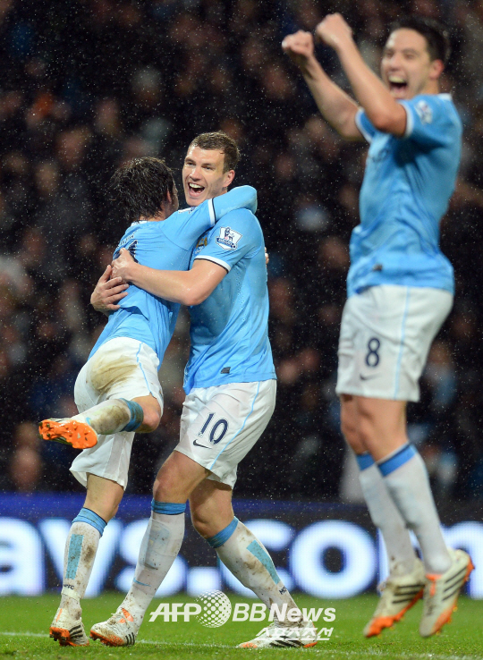 맨시티의 에딘 제코(중앙)가 두번째 골을 터뜨린 뒤 동료들의 축하를 받고 있다. ⓒAFPBBNews = News1
