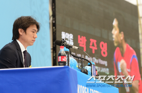 2014 브라질월드컵에 출전하는 축구대표팀 명단 발표식이 8일 파주 축구트레이닝센터(NFC)에서 열렸다. 단상에 앉은 홍명보 감독이 박주영의 이름을 발표하고 있다. 파주=정재근기자 cjg@sportschosun.com/2014.05.08/ |