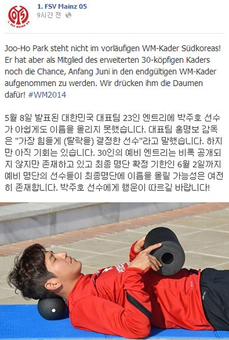 마인츠는 9일(한국시각) 공식 페이스북을 통해 박주호의 브라질월드컵 출전 명단 제외 소식을 전했다. 마인츠는 고배를 마신 박주호를 위로하고 격려했다. 마인츠는 '박주호가 월드컵에 나설 대표팀에 이름을 올리지 못했다'며 '그래도 6월2일까지 30인 예비엔트리 선수들에게는 아직 기회가 있다. 행운이 따르길 바란다'고 했다.