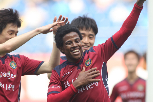 대전은 11일 대전월드컵경기장에서 열린 안산 경찰축구단과의 2014년 현대오일뱅크 K-리그 챌린지 8라운드에서 아드리아노의 두골을 앞세워 2대0 완승을 거뒀다. 이날 경기는 챌린지 양강의 대결로 관심을 모았다. 경기는 생각보다 싱겁게 끝이 났다. '괴물' 아드리아노의 원맨쇼가 펼쳐졌다. 아드리아노는 전반 33분과 42분 연속골을 터뜨리며 승리의 주역이 됐다. 아드리아노는 시즌 11호골로 챌린지 득점선두를 질주했다. 8경기 11골의 엄청난 득점레이스를 이어가고 있다. 7경기 연속 무패(6승1무)를 달린 대전은 승점 19점으로 선두를 지켰다. 안산은 3경기 연속 무승(1무2패)의 수렁에 빠졌다.