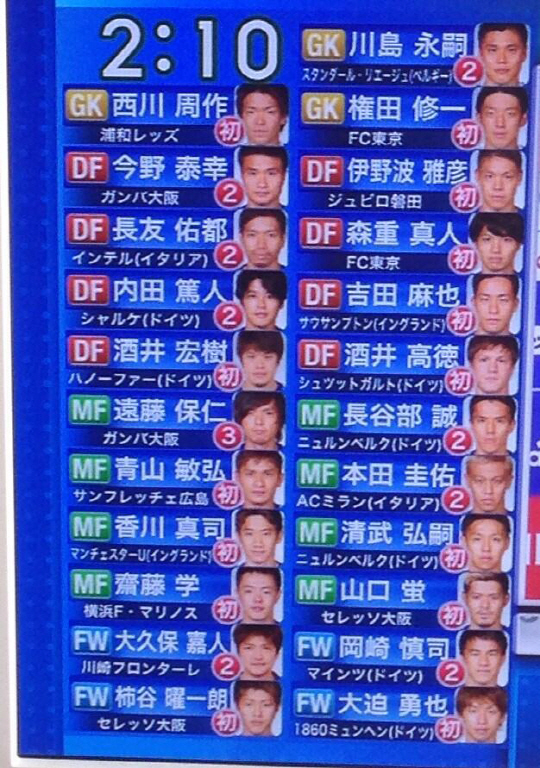 자케로니 감독은 12일 오후 2시 인터넷 유튜브를 통해 생중계된 대표팀 명단 발표에서 카카와 신지, 오카자키 신지, 혼다 케이스케, 하세베 마코토 등 23명의 이름을 일일이 호명했다. 일본 대표팀은 27일 사이타마스타디움에서 키프로스와 평가전을 갖고 ,이후 미국 전훈지에서 코스타리카-잠비아와의 평가전을 갖는다. 브라질월드컵 본선무대에서 6월 14일 코트디부아르와의 첫경기를 필두로, 19일 그리스, 24일 콜롬비아와 격돌한다.