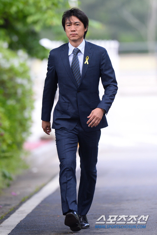 홍 감독이 가장 먼저 파주NFC에 나타났다. 그는 세월호 참사 희생자를 추모하기 위해 가슴에 노란 리본을 달았다.