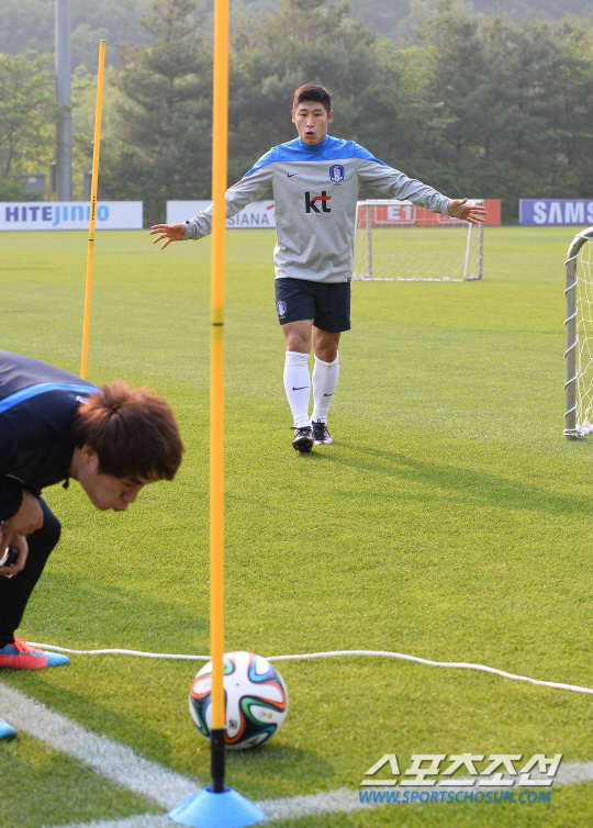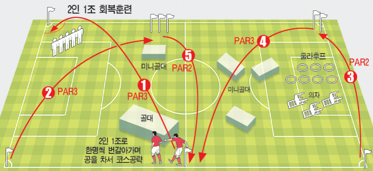 12일 파주NFC에 소집된 태극전사들의 첫 훈련은 회복에 초점이 맞춰졌다. 가볍고 즐거웠다. 지루함을 덜고자, 놀이적 요소를 첨가했다. 일명 '축구 골프'다. 김승규-이근호, 정성룡-이 용, 기성용-박주영, 이범영-이청용, 김신욱-조광수 통역(일본어)이 2인 1조로 한 팀을 이뤘다. 훈련 방식은 간단하다. 목표 지점에 골을 넣거나 목표물을 맞추면 된다. 반면 그라운드는 복잡하다. 프리킥 훈련용 구조물, 폴대, 의자, 훌라후프, 미니 골대, 정규 골대 등 장애물이 즐비하다. 장애물을 이용하거나 넘어서야 한다. 2인1조로 다섯개 팀이 각각 출발점에 선다. 먼저 한 선수가 공을 길게 찬다. 골프의 티샷과 같다. 두 명이 함께 공이 멈춘 지점까지 이동한 뒤 다음 선수가 두 번째 킥을 한다. 장애물을 넘어야 하기에 정교한 킥이 요구된다. 다시 처음 공을 찬 선수가 세 번째 킥을 해 목표 지점에 축구 공을 넣으면 되는 훈련이다. 조별로 골프의 캐디 역할을 하는 한 명의 코치가 붙는다. 총 5개의 코스 중 4개는 대각선으로, 한 개의 코스는 직선으로 만들어졌다. 대각선 코스는 3번에, 직선 코스는 2번에 목표에 도달해야 한다. 쉽게 얘기하면 골프의 파3, 파2 홀이다. 결코 쉬운 훈련은 아니다. 킥을 할 때는 착지지점을 염두에 둬야 하기에 강한 집중력이 요구된다. 공이 멈추는 지점까지는 가볍게 러닝을 해야 한다. 킥과 러닝을 동시에 소화할 수 있는 훈련인 셈이다. 선수들도 생소한 훈련에 즐거워했다. 이 용은 "오늘은 레크레이션같았다. 긴장하지말고 편하게 하자는 분위기같다. 훈련 목적은 회복과 발 감각을 끌어올리는데 있었다"고 설명했다. '축구 골프'는 네덜란드 출신의 안톤 두샤트니에 코치의 아이디어로 알려졌다. 파주=하성룡 기자 jackiechan@sportschosun.com