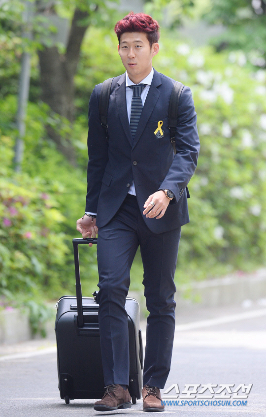 월드컵국가대표팀 훈련을 위해 독일에서 귀국한 손흥민, 구자철, 지동원, 홍정호가 파주 국가대표팀 훈련장에 소집돼 훈련을 시작한다. 손흥민이 13일 오후 정장차림으로 파주국가대표트레이닝 센터에 입소하고 있다. 네명의 독일파 선수들은 앞서 12일 소집된 박주영(29·왓포드), 기성용(25·선더랜드), 이청용(26·볼턴), 정성룡(29·수원), 김승규(24), 김신욱(26), 이용(28·이상 울산), 이범영(25·부산), 이근호(29·상주) 등 9명과 합류해 월드컵을 위한 본격적인 담금질에 돌입한다. 파주=최문영 기자 deer@sportschosun.com /2014.05.13/