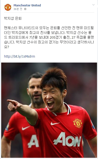 박지성의 전 소속팀 맨체스터 유나이티드가 박지성의 은퇴 소식을 한글로 알려 눈길을 끌고 있다.