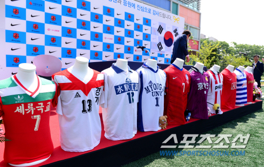 '박지성 공식 은퇴(?)' 박지성이 14일 경기도 수원 박지성축구센터에서 기자회견을 열었다. 올 시즌 네덜란드 프로축구 PSV 에인트호번에서 1년 간의 임대 생활을 마친 박지성은 원 소속팀 잉글랜드 퀀즈파크 레인저스로 복귀해야한다. 하지만, 최근 네덜란드 언론은 무릎 부상에 시달린 박지성이 은퇴를 선언할 것으로 보도 했다. 기자회견장에 박지성이 그 동안 입었던 유니폼이 전시되어 있다. 수원=송정헌 기자 songs@sportschosun.com/2014.05.14
