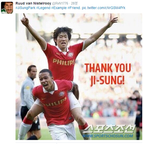 판 니스텔루이는 14일 자신의 SNS에 PSV 에인트호벤 측이 공개한 "박지성 고맙다!"라는 사진을 올리며 "#JiSungPark #Legend #Example #Friend"라는 해쉬태그를 적었다.