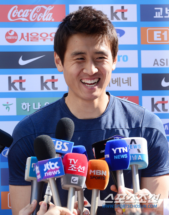 홍명보호가 15일 파주 NFC(국가대표축구트레이닝센터)에서 넷째 날 훈련을 했다. 구자철이 인터뷰에서 활짝 웃고 있다. 파주=정재근기자 cjg@sportschosun.com/2014.05.15/