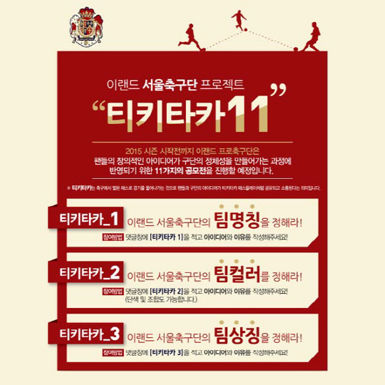 잠실 올림픽경기장을 홈으로 사용하게 될 이랜드 프로축구단은 2015년 시즌이 시작되기 전까지 '티키타카 11'이란 컨셉으로 11가지의 다양한 공모전을 진행할 계획이다. '티키타카 11'은 바르셀로나의 짧은패스를 주고 받으며 경기를 이끌어나가는 전술에서 착안하여, 팬들과 구단의 아이디어가 지속적으로 공유되고 소통되는 컨셉으로 진행될 예정이다. 이랜드 프로축구단은 "팬들의 의견을 듣고 구단의 운영에 반영하는 것은 창단 과정뿐 아니라 그 이후에도 이랜드 프로축구단이 갖는 중요한 경영철학"이라고 밝혔다.