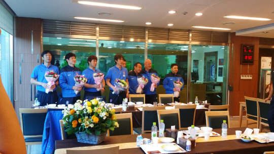 제주 유나이티드 선수단도 9일 박경훈 감독을 비롯한 코칭스태프들에게 정성껏 준비한 선물을 줬다. 박 감독은 "경기를 하루 앞두고 신경 쓸 일이 많았을텐데 이렇게 뜻깊은 자리를 마련해준 선수들에게 정말 고맙다. 앞으로도 서로 의지하며 함께 나아갔으면 좋겠다"고 웃었다.