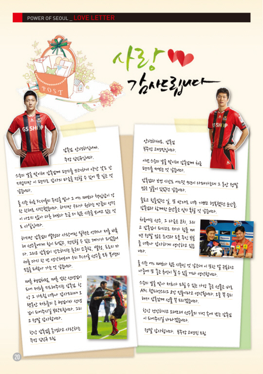 FC서울에서는 '주장' 김진규와 '부주장' 고명진이 나섰다. 편지로 감사의 마음을 전했다. 김진규는 '감독님께 편지를 쓰려니 약간 낯도 간지럽지만, 감사의 마음을 전할 수 있어 뜻 깊은 것 같습니다'며 '감독님의 열정과 사랑 어린 질책이 저를 비롯한 선수단에 큰 힘이 됐습니다. 때론 형님처럼, 때론 엄한 선생님이 되어 지도해주시는 감독님의 가르침에 감사드리며, 항상 큰 형님이자 선생님이 되어주시실 부탁드립니다'고 썼다. 고명진도 '슬프고 힘들었던 일, 기쁘고 행복했던 순간들을 감독님과 함께해서 잊지 못할 것 같습니다. 힘든 시즌 중 많은 조언 너무나 감사드립니다. 항상 건강하고 오래 선수들의 기억에 남는 감독님이 되어주시길 바라겠습니다'고 했다.