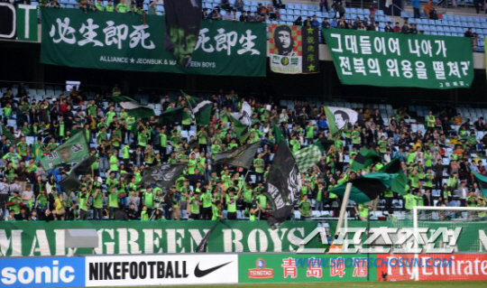 그런데 전북 서포터스 MGB(Mad Green Boys)는 자신들이 응원하는 구단의 수준이 아직도 '구멍가게'인 줄 아는 모양새다. 지난 13일 포항 스틸야드에서 보여준 매너는 가관이었다. 전반 36분 포항 이명주와 볼을 다투다 넘어진 뒤 박치기를 한 전북 최보경이 퇴장 처분을 받았다. 그러자 그라운드를 향해 'XXXX 이명주' '이명주 꺼져' 등 듣기도 민망한 욕설을 쏟아냈다. 안전요원이 깃발을 그라운드로 던지려던 서포터스를 제재하기 위해 다가서자 오히려 위협적인 제스쳐를 취하기도 했다. 영호남을 넘어 K-리그를 대표해 아시아 무대에서 싸우는 두 팀을 보기 위해 평일 저녁 경기장을 찾은 관중들에게는 '공해'였다. 아이들을 데리고 경기장을 찾은 부모에겐 지우고 싶은 장면이었다. 전북 구단 관계자들의 만류도 먹혀들지 않았다. 서포터스석에 구단 관계자들이 충돌을 우려한 나머지 자제를 요청했으나, 흥분한 팬들의 마음을 가라앉히기엔 역부족이었다. 전북 구단 관계자는 "팬들이 이명주가 의도적으로 파울을 했다고 보고 굉장히 흥분했다. 하지만 후반전에는 자제를 했다"고 말했다. 참다 못한 포항 팬들이 박수를 치고 '이명주'를 연호했으나, 뒷맛이 개운치 않았다.