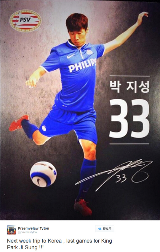 PSV의 폴란드 대표팀 수문장 프르제미슬라브 티톤(27)은 지난 주말 자신의 SNS에 "다음 주 한국에 간다"고 설렘을 나타내면서 "'킹' 박지성의 마지막 경기를 위하여!"라고 박지성을 치켜세웠다.