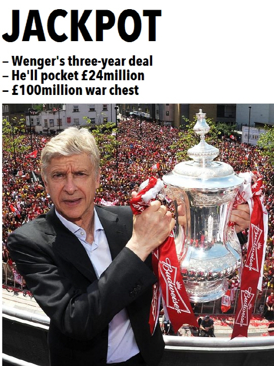 19일(한국시각) 영국 일간지 더선은 벵거 감독이 72시간 내에 아스널과 재계약에 서명할 것이라고 보도했다. 3년간 2400만파운드를 받는 조건이다. 여기에 이적자금으로 1억파운드를 손에 넣었다. 벵거 감독은 FA컵을 손에 넣으며 9년 무관 설움을 씻었다. 트로피에 대한 부담감을 던 벵거 감독은 리그 우승을 위해 선수 보강을 약속했다. 벵거 감독은 "스쿼드를 더 강하게 하려면 2~3명의 선수를 데려와야 한다. 물론 쉽지 않은 일이다"고 했다.