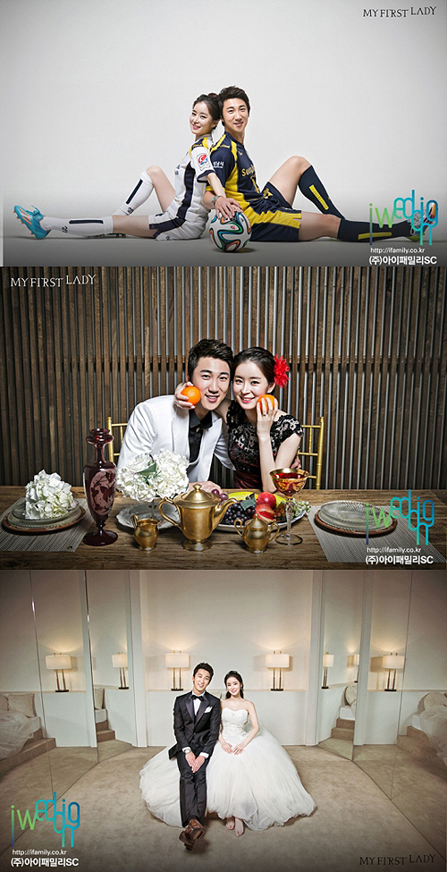 웨딩 촬영을 담당한 관계자는 "촬영 내내 예비신랑이 특유의 활발함으로 예비신부의 긴장을 풀어주고 즐거움을 선사하는 등 화기애애한 분위기를 연출해 자연스럽고 유쾌한 모습을 담을 수 있었다"며 "드레스와 턱시도 컷 외, 성남 FC 유니폼도 입고 촬영하며 축구에 대한 한 자부심과 애착을 드러냈다"고 전했다.