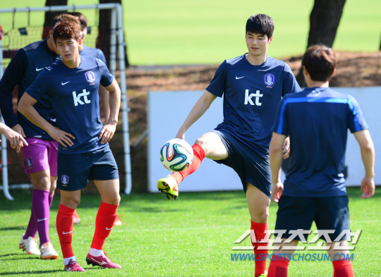 홍명보호가 15일 파주 NFC(국가대표축구트레이닝센터)에서 넷째 날 훈련을 했다. 기성용이 훈련이 시작되기 전 동료들과 공을 주고받으며 몸을 풀고 있다. 파주=정재근기자 cjg@sportschosun.com/2014.05.15/ |