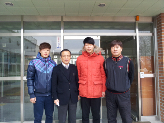 2012년 모교인 전주공고를 방문해 강원길 감독(맨 오른쪽)과 만난 김영권. 사진제공=강원길 감독