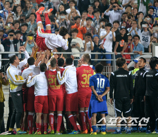 박지성이 국내 팬들에게 고별인사를 한다. 2014 PSV 에인트호벤 코리아투어 1차전 수원 삼성과의 경기가 22일 수원월드컵경기장에서 열렸다. 박지성이경기 종료 후 팀 동료들에게 행가레를 받고 있다. 수원=허상욱 기자 wook@sportschosun.com/2014.05.22/