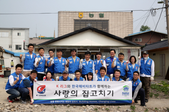 한국프로축구연맹(총재 권오갑)은 23일 경기도 파주시 법원읍 한국해비타트 파주 현장에서 'K-리그와 함께하는 사랑의 집 고치기' 봉사활동을 가졌다. 이번 봉사 활동에는 권오갑 총재, 한웅수 사무총장, 이운택 심판위원장, 신태용 K-리그 홍보대사를 비롯하여 연맹 임직원 전원이 참여했다. 봉사단은 총 3개조로 나뉘어 기초생활수급자, 장애인 가정, 독거노인 등 총 3세대에 투입돼 도배, 장판 교체, 창문 교체, 단열 작업 등을 하며 하루 종일 구슬땀을 흘렸다.