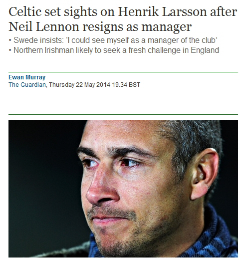 영국 일간지 가디언은 23일(한국시각) 라르손 팔켄베리 감독이 사임한 닐 레넌 감독의 후임자 후보에 올랐다고 보도했다. 4년간 셀틱을 지휘한 레논 감독은 새로운 도전을 위해 셀틱을 떠나기로 했다. 레넌 감독은 기성용과 차두리를 지휘한 바 있다.