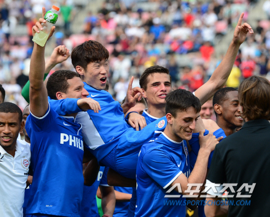 2014 PSV 아인트호벤 코리아투어 2차전 경남 FC와의 경기가 24일 창원축구센터에서 열렸다. 모든 경기가 끝난 후 아인트호벤 선수들이 박지성을 무등 태워 그라운드를 돌고 있다. 창원=정재근 기자 cjg@sportschosun.com/2014.05.24/