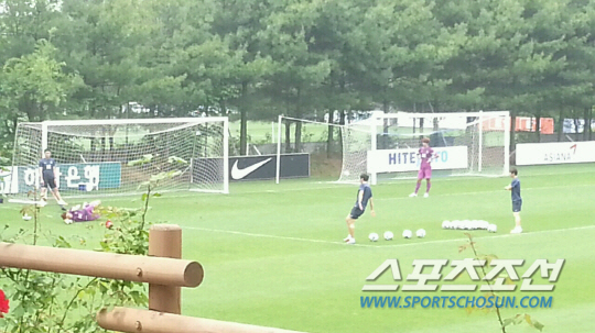 24일 오전 파주NFC(국가대표트레이닝센터). 고요한 그라운드에 코칭스태프들의 불호령이 쩌렁쩌렁 울려 퍼졌다. 허리에 굵은 고무밴드를 감은 정성룡(29·수원)은 땀을 비오듯 흘리면서도 볼을 노려보면서 방어 자세를 취했다. 김봉수 골키퍼 코치가 쉴새없이 날리는 슛을 막기 위해 골문 구석을 뛰었다. 고무밴드로 인해 활동폭이 좁을 수밖에 없었다. 있는 힘껏 팔을 뻗으면서 볼을 막았다. 체력 소모는 평소에 비해 훨씬 클 수밖에 없다. 가쁜 숨을 몰아쉬면서 그라운드로 고개를 떨구자 또 불호령이 떨어졌다. 곁에서 이를 지켜보는 이범영(25·부산) 김승규(24·울산)의 얼굴에는 긴장된 표정이 역력했다. 이날 오전 필드 플레이어들은 오후 훈련에 대비해 숙소에서 각자 가벼운 훈련이나 휴식을 했다. 하지만 골키퍼들은 1시간 가량 고강도 훈련으로 몸을 달궜다.