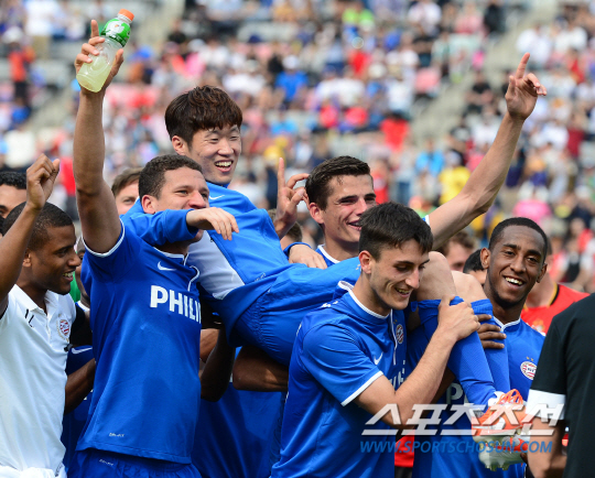 2014 PSV 아인트호벤 코리아투어 2차전 경남 FC와의 경기가 24일 창원축구센터에서 열렸다. 모든 경기가 끝난 후 아인트호벤 선수들이 박지성을 무등 태워 그라운드를 돌고 있다. 창원=정재근 기자 cjg@sportschosun.com/2014.05.24/