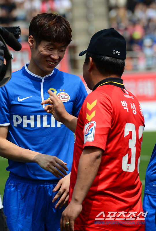 2014 PSV 아인트호벤 코리아투어 2차전 경남 FC와의 경기가 24일 창원축구센터에서 열렸다. 경기 전 귀빈으로 참석한 박지성의 아버지 박성종씨가 선수들과 악수를 나눴다. 박지성이 아버지와 악수를 나누며 웃고 있다. 창원=정재근 기자 cjg@sportschosun.com/2014.05.24/
