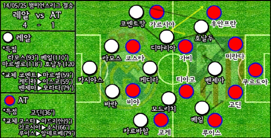 이 상황에서의 중대한 변수는 시메오네 감독의 '굳히기 시간대'. 레알은 바란과 라모스까지 공격에 관여할 만큼 모든 수단을 총동원했고, AT는 1차 수비 저지선을 7~80분대까지 내릴 생각이 없어 보였다. 모든 힘을 짜낸 정면 승부는 화끈했지만, 수비벽에 생기는 균열까지 막을 수는 없었다. 디 마리아의 크로스가, 베일의 드리블이 살아 들어오기 시작한 것도 이때부터다. 상대의 공격 템포를 꺾어놓지 못한 AT는 숨 고를 시간대를 놓쳤고, 공간을 내주고 치고받는 격렬한 양상에 힘겨워했다. 결국엔 93분에 내준 코너킥에 주저앉았다. 쿠르트아의 피지컬이 뛰어나다고 해도 옆 그물을 찌르는 라모스의 헤더를 막기엔 역부족이었다.