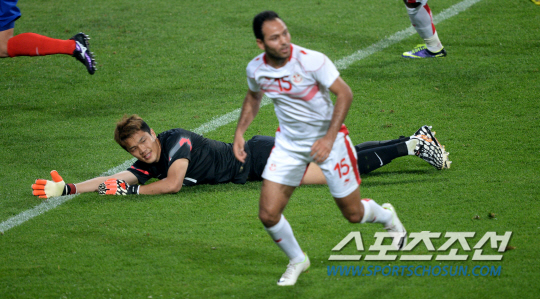 2014 브라질 월드컵을 앞둔 홍명보호가 알제리의 가상 상대인 튀니지와 평가전을 갖는다. 28일 서울월드컵경기장에서 열린 한국과 튀니지의 경기에서 전반 골키퍼 정성룡이 다우아디(15번)에게 선제골을 허용한 후 아쉬워하고 있다. 상암=허상욱 기자 wook@sportschosun.com/