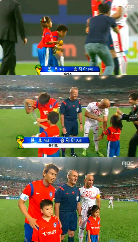 경기에 앞서 윤후와 지아는 매치볼 전달을 위해 축구장에 모습을 드러냈다. 특히 윤후는 한국 대표팀 주장 구자철에게 90도로 꾸벅 인사하며 '귀요미 매력'을 뽐냈다. 윤후와 지아는 구자철, 아이멘 압덴누르(튀지니 주장)과 악수를 나눈 후 기념촬영 시간을 가졌다.