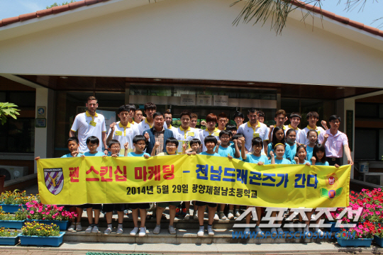 K-리그 클래식 4강, 전남드래곤즈 선수단이 29일 점심시간 포스코교육재단 산하 광양제철남초등학교와 광양제철초등학교를 깜짝방문했다.
