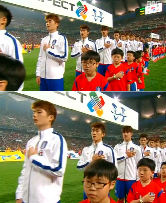 한국 축구 국가대표팀 기성용(25·선덜랜드)의 국기에 대한 경례가 논란이 되고 있다. 나 홀로 왼손을 올린 장면이 중계 카메라에 잡혔다.