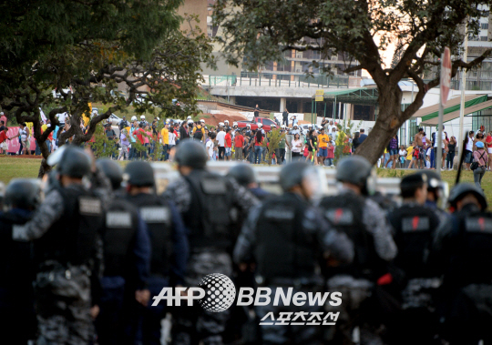 | ◇브라질 경찰들이 28일(한국시각) 브라질리아에서 시위대 행진을 막기 위해 전진하고 있다. ⓒAFPBBNews = News1 |