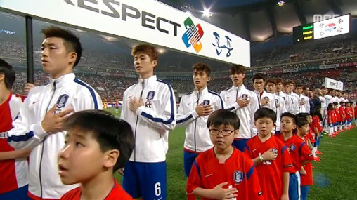 이날 평가전에 앞서 국민의례가 거행되며 애국가가 울려 퍼졌고, 이때 기성용은 왼손을 가슴에 올리며 국기에 경례를 했다.