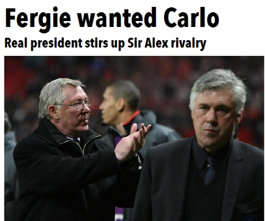 플로렌티노 페레즈 레알 마드리드 회장의 말이다. 26년간 맨유를 이끈 알렉스 퍼거슨 감독은 은퇴를 선언한 후 후임자로 데이비드 모예스 감독을 지목했다. 모예스는 기대와 달리 부진한 모습을 보이며 1년도 되지 않아 맨유 지휘봉을 놓았다. 페레즈 회장은 29일(한국시각) 영국 일간지 더선을 통해 사실 퍼거슨 감독이 진짜 원했던 후임자는 모예스가 아니라 카를로 안첼로티 감독이었다고 주장했다. 페레즈 회장은 "나는 내 주장을 확신할 수 있다"며 "지난시즌 퍼거슨 감독은 안첼로티 감독에게 자신의 뒤를 이을 수 있는지 물었다"고 했다.